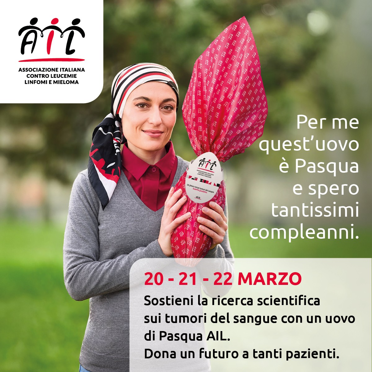 L’Associazione Italiana contro le Leucemie (AIL) si dedica alla promozione e al supporto della ricerca scientifica per la cura delle leucemie, dei linfomi e del mieloma; assiste i pazienti e le famiglie accompagnandoli in tutte le fasi del percorso attraverso la malattia con servizi adeguati alle loro esigenze; si propone di migliorare la qualità di vita dei malati e di sensibilizzare l’opinione pubblica alla lotta contro le malattie del sangue.